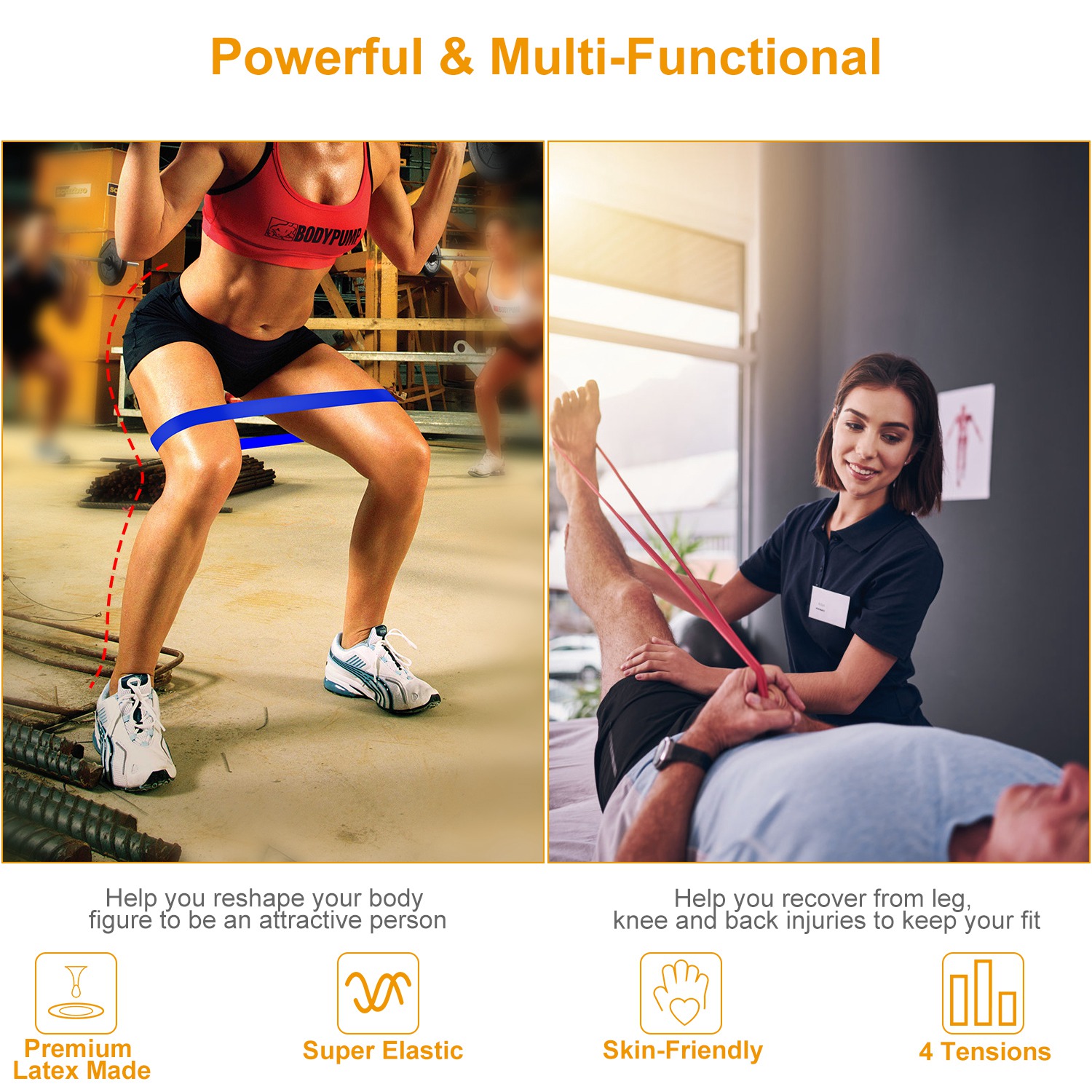 Say good bye to traditional dull fitness method, embrace and try a more interesting fitness method with our sturdy, elastic and skin-friendly latex-made resistant loop band. It comes with 4 selectable strength stages (light/medium/heavy/extra heavy) separately realizing by including 4-colored bands (blue/yellow/red/black) to meet your different needs when you are doing workout, yoga, pilates, general stretching, muscle training, body toning, etc. Additionally, it owns a considerate carrying bog to help you to carry this lightweight (total 0.26lbs) resistance band set easily, and a user-friendly instruction guide to help you learn to fit yourself as soon as possible.